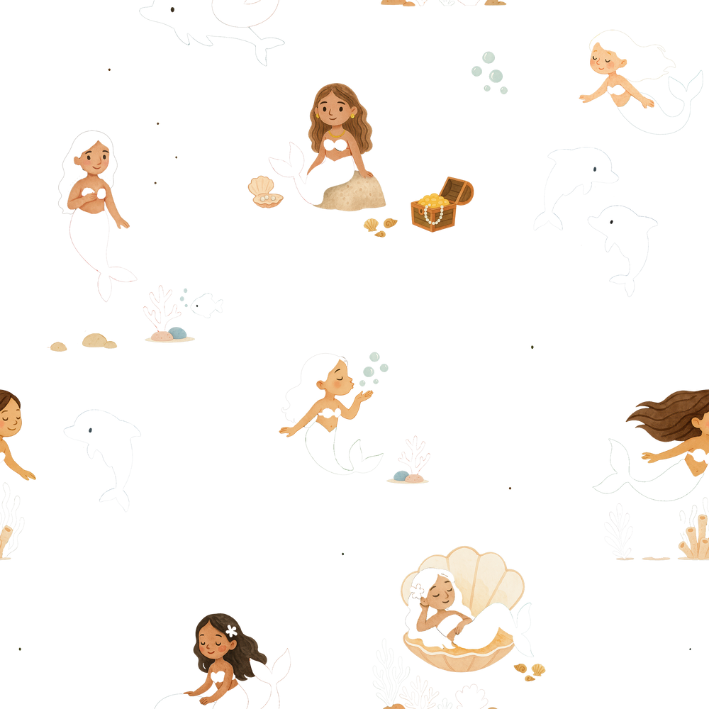 The Alana - Little Mermaid Treasures Wallpaper elegantly captures the magical allure of the ocean’s depths and its treasures. Adorned with graceful mermaids and sweet sea creatures, this sophisticated design adds a serene and refined ambiance to any room, evoking the timeless beauty and mystery of the mermaid’s realm.