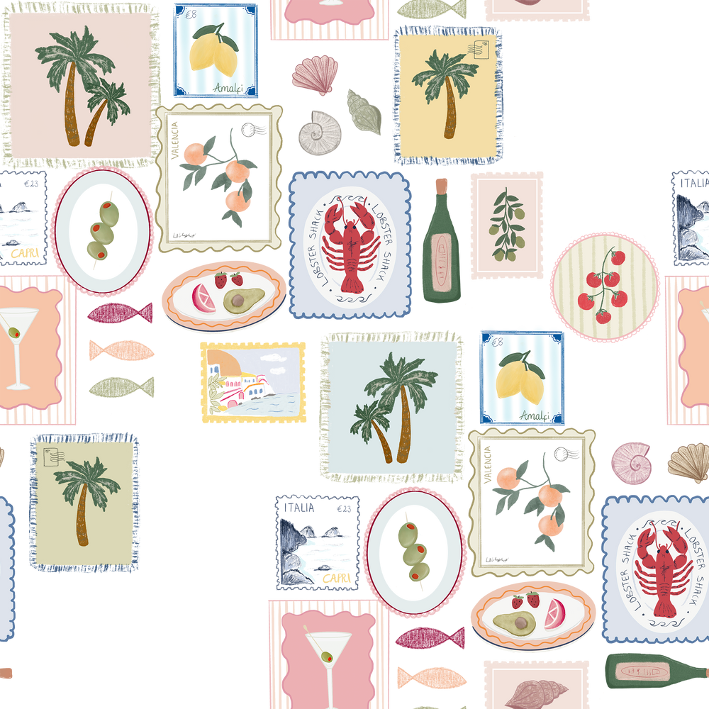 Indulge in the vibrant spirit of the Mediterranean with Monica our blissful Mediterranean Summer Stamps Wallpaper. Featuring colourful, playful prints and charming hand drawn illustrations in a patchwork style, this wallpaper brings a sophisticated yet lively ambiance to any space. Perfect for adding a touch of warmth and artistic flair with its pastel tones, it transforms your walls into a celebration of summer’s joyful essence.