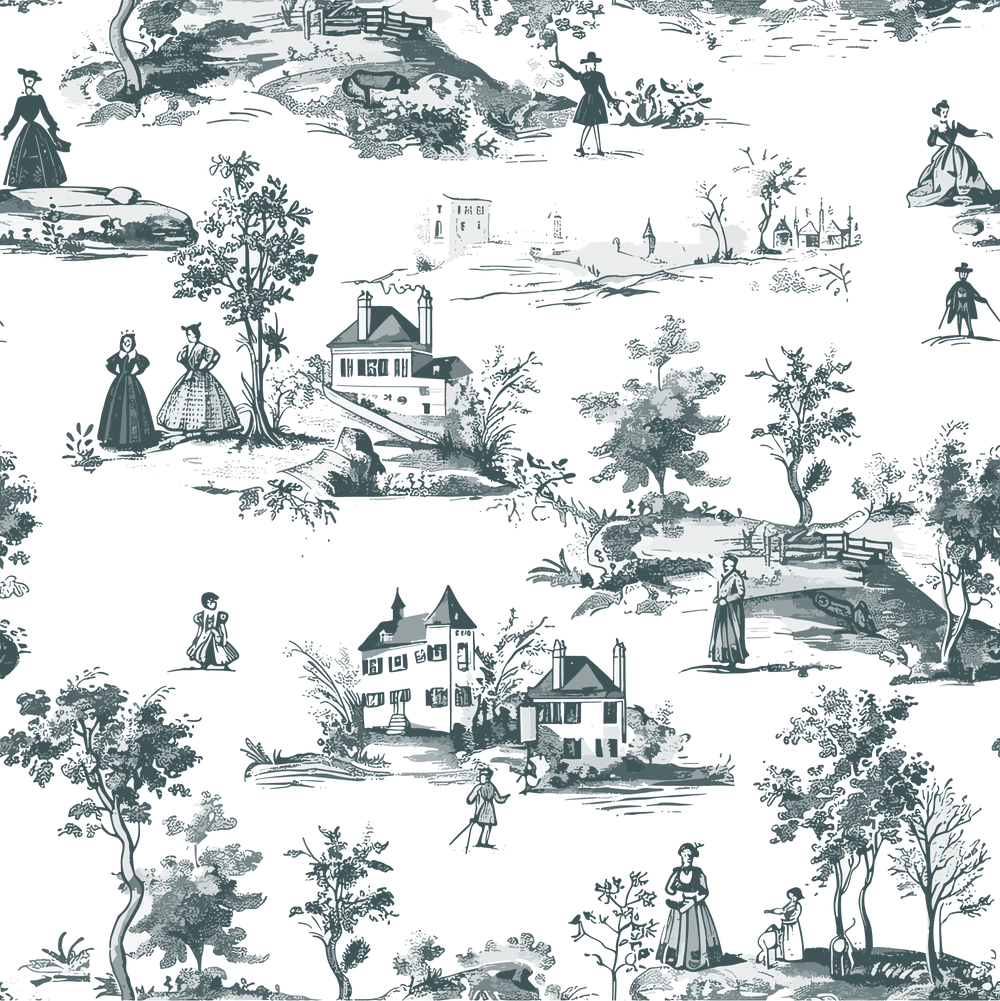 The “Camille” wallpaper brings a nostalgic glimpse of the French countryside with its vintage toile design, featuring scenes of colonial-style houses, gardens, and Victorian women and children. The delicate emerald green etchings on a soft cream background showcase quaint cottages, lush trees, and charming pastoral landscapes. This elegant, timeless pattern evokes a sense of history and sophistication, making it perfect for those seeking to create a classic, countryside-inspired space with French vintage charm.